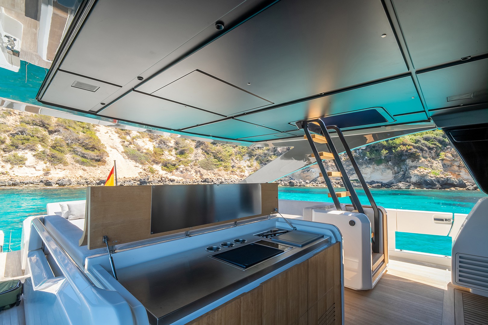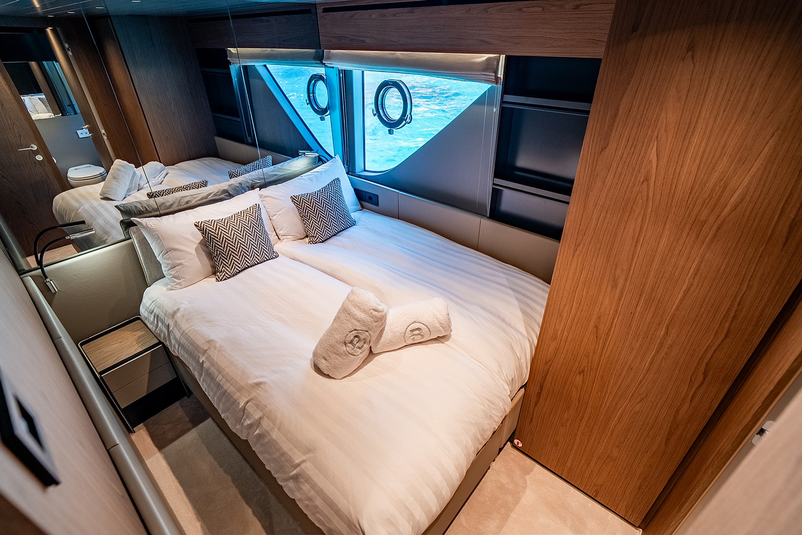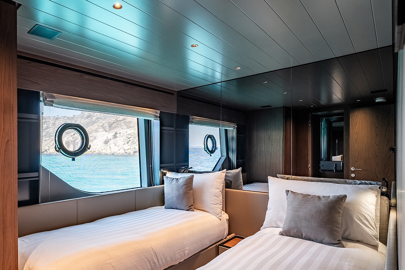 Warm Canaletto walnut finishes meet smooth leather accents, while soft blue tones reflect the calm of the surrounding sea. The expansive saloon opens effortlessly to the outside, blending luxurious interiors with the natural beauty of the ocean breeze.