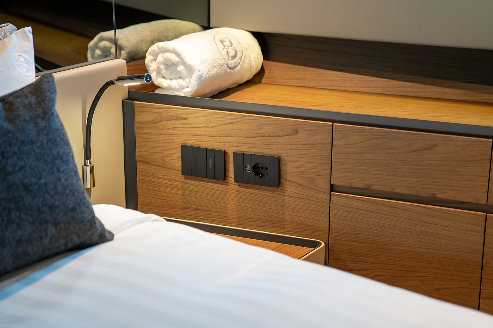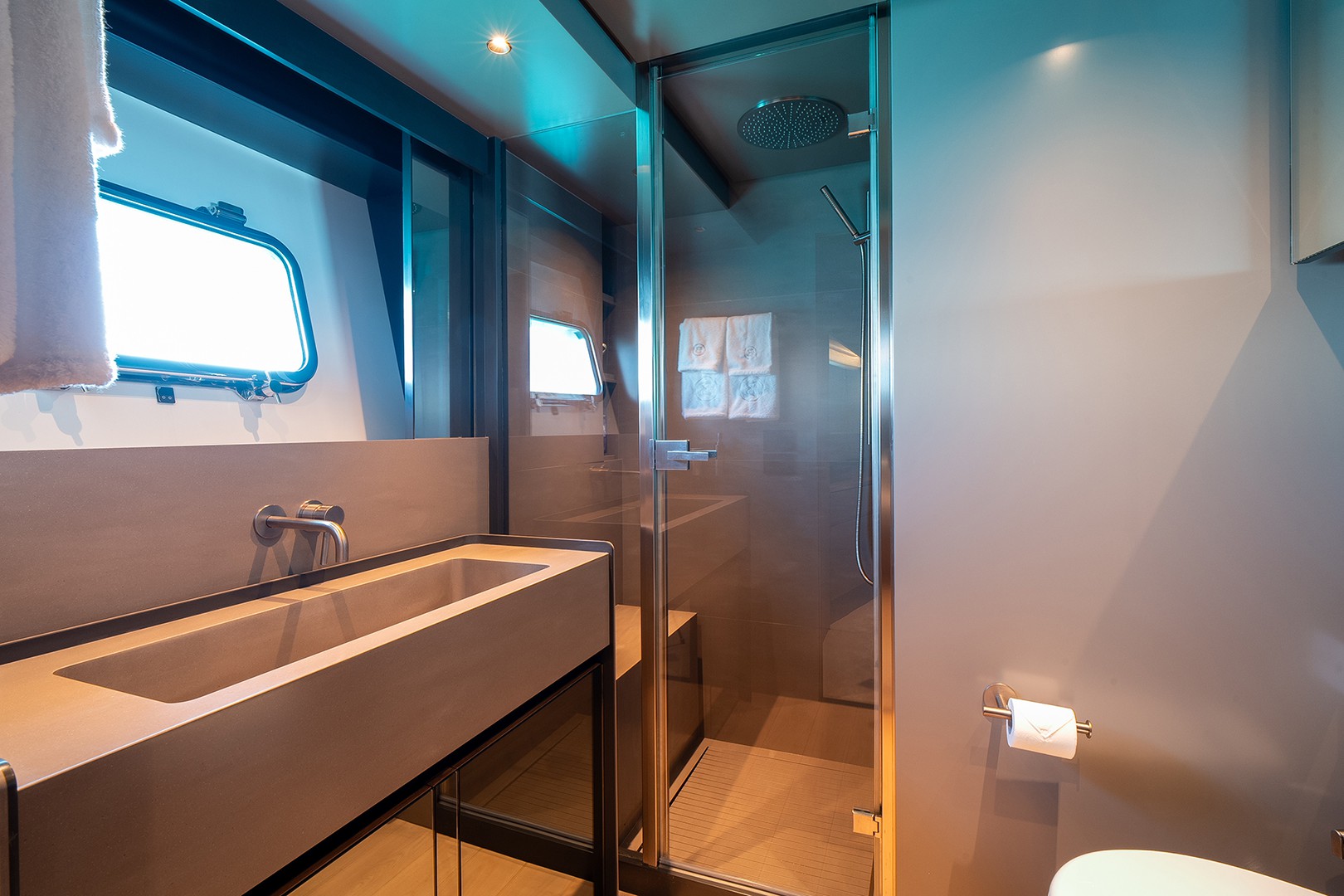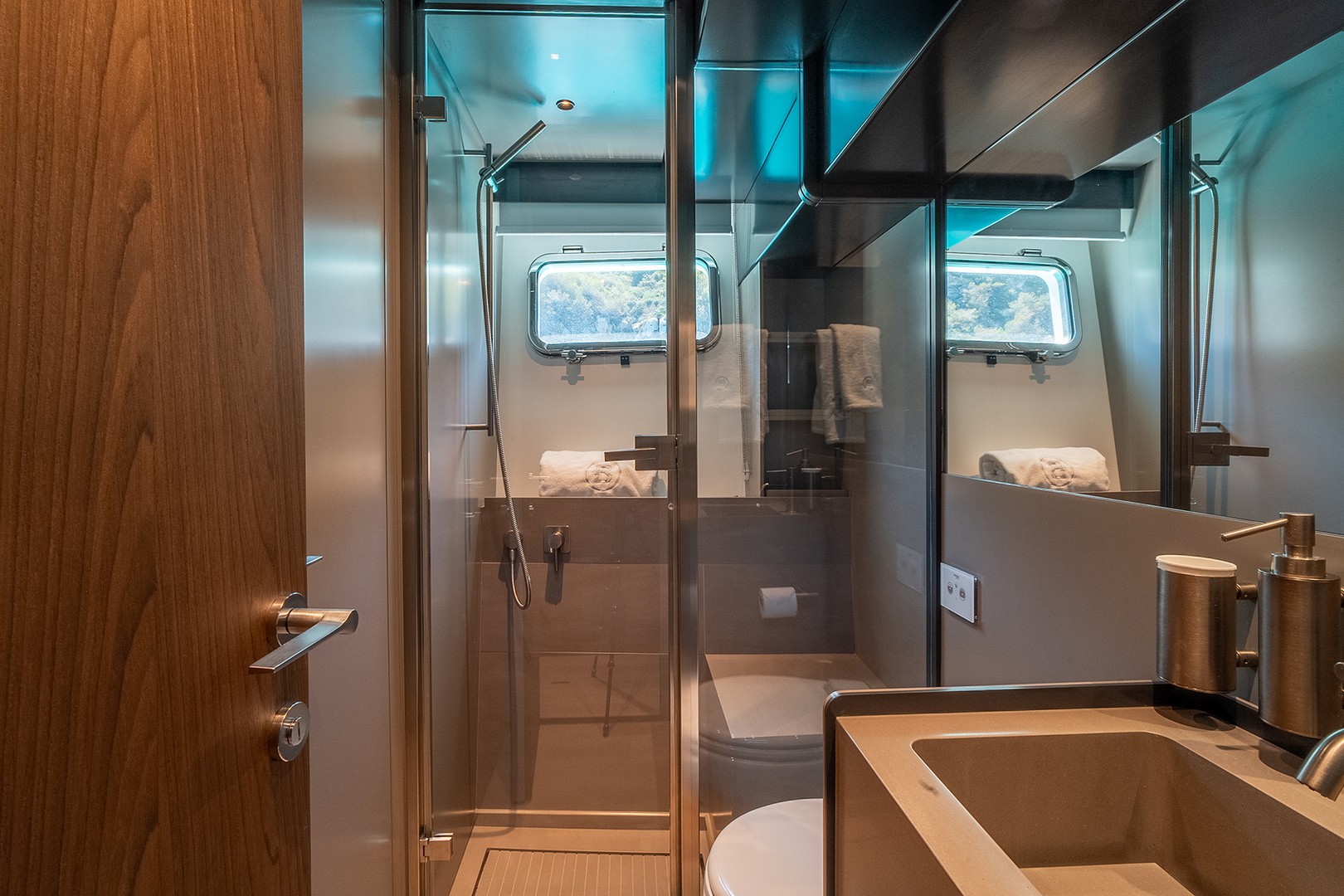 Warm Canaletto walnut finishes meet smooth leather accents, while soft blue tones reflect the calm of the surrounding sea. The expansive saloon opens effortlessly to the outside, blending luxurious interiors with the natural beauty of the ocean breeze.